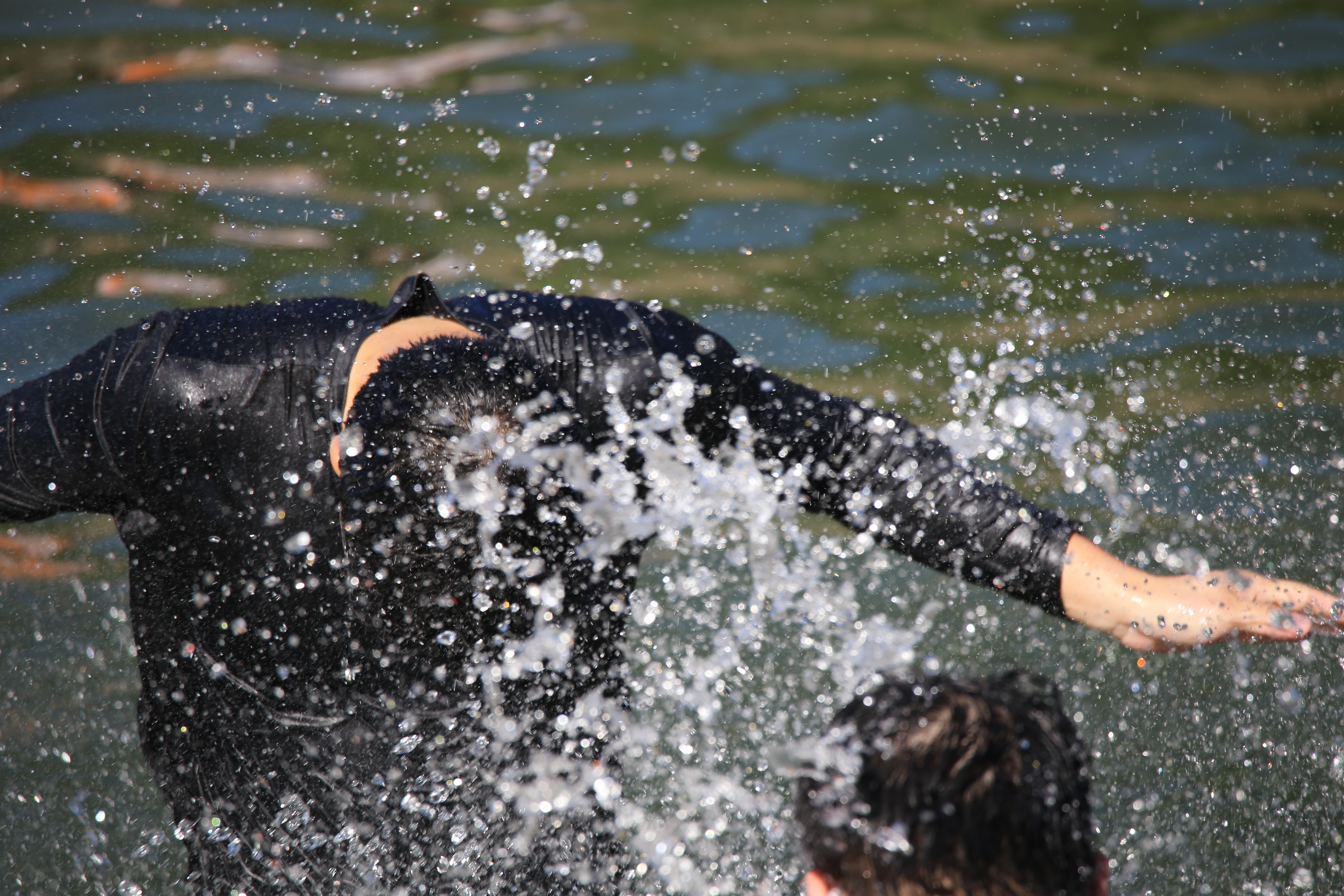 한 피서객이 검은 래시가드를 입고 물속에서 머리를 젖히며 힘차게 물을 튀기고 있다.